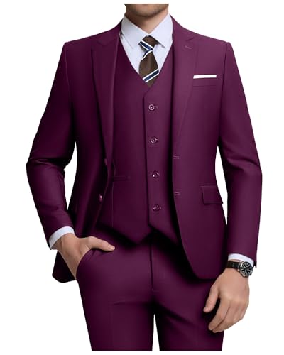 Holivyer Ensemble de Costume 3 pièces pour Homme, Coupe ajustée, Blazer à Deux Boutons, Veste Unie, Gilet, Pantalon, Costume d'affaires de Mariage, Prune, S Report This