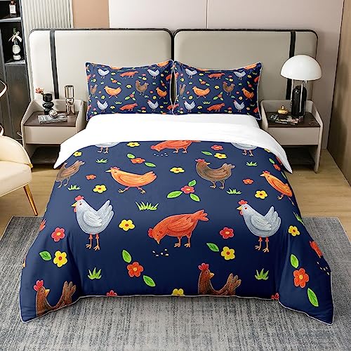 Hahn Housse de couette 100 % coton avec 1 taie d'oreiller, motif : poules colorées, fleurs botaniques, motif de ferme, pour enfant Report This
