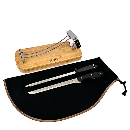 NERTHUS Support à jambon pliable en acier et bambou + couvre-jambon noir + aiguiseur manuel + couteau à jambon