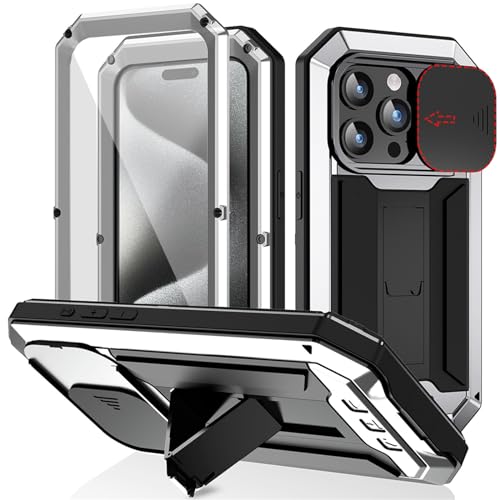 qichenlu Coque de protection anti-chocs en métal et silicone compatible avec iPhone 15 Pro, support coulissant pour appareil photo, coque blindée anti-chute, argent Report This